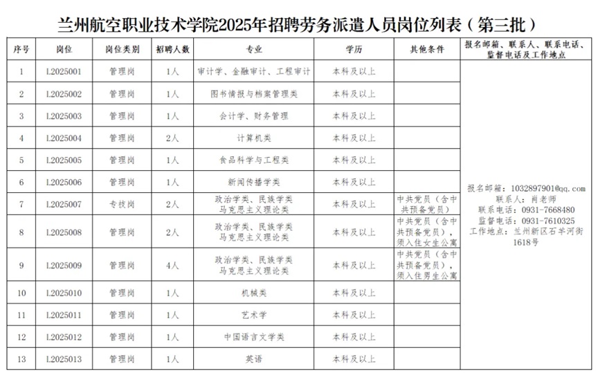 原标题:兰州航空职业技术学院2025年招聘劳务派遣人员公告(第三批)