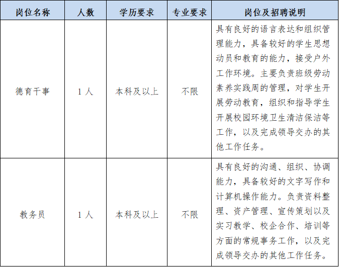 佛山市高明区职业技术学校是一所由政府举办的广东省重点中等职业学校,位于佛山市高明区职业教育园。学校占地面积202亩,环境优美,校舍建筑面积 87246 平方米,教学设备设施先进,设备总值超6500万元,开设物联网技术应用、旅游管理与服务、新能源汽车运用与维修、智能设备运行与维护等10个专业,在校学生3400多人。学校坚持“以人为本,以质立校”的办学理念,着力培养高素质技术技能人才,为区域经济社会发展服务。因学校发展需要,现面向社会公开招聘教辅工作人员2名。现将招聘有关事宜公告如下: