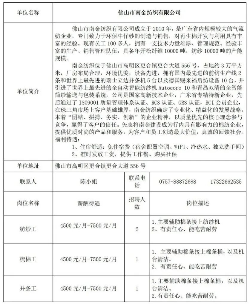 佛山市南金纺织有限公司招聘