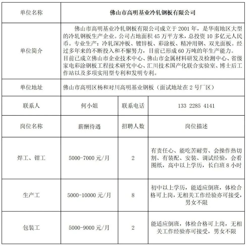 - 佛山市高明基业冷轧钢板有限公司招聘