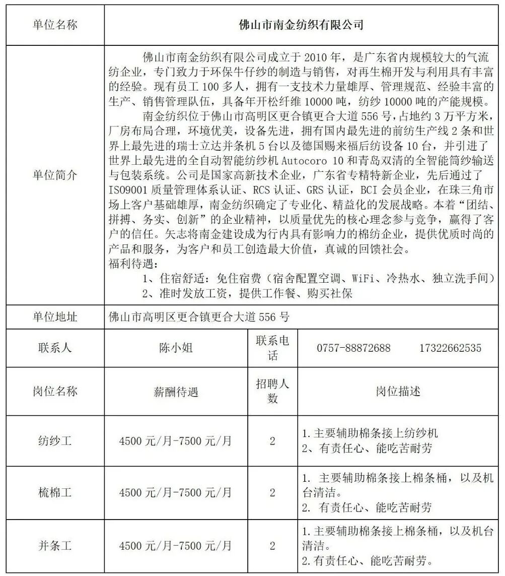 - 佛山市南金纺织有限公司招聘