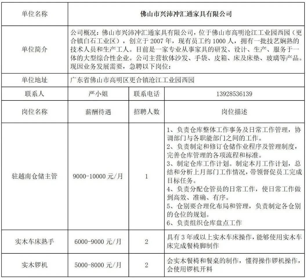 - 佛山市兴沛冲汇通家具有限公司招聘