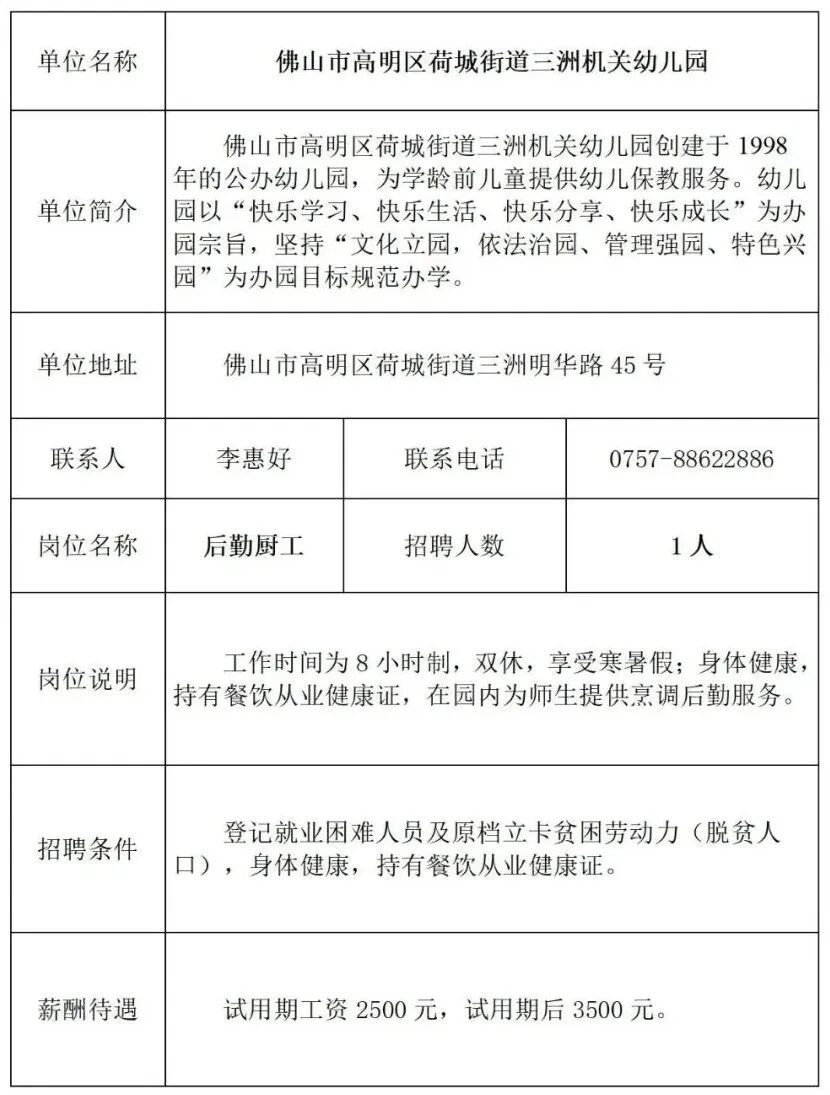 - 佛山市高明区荷城街道三洲机关幼儿园 招聘