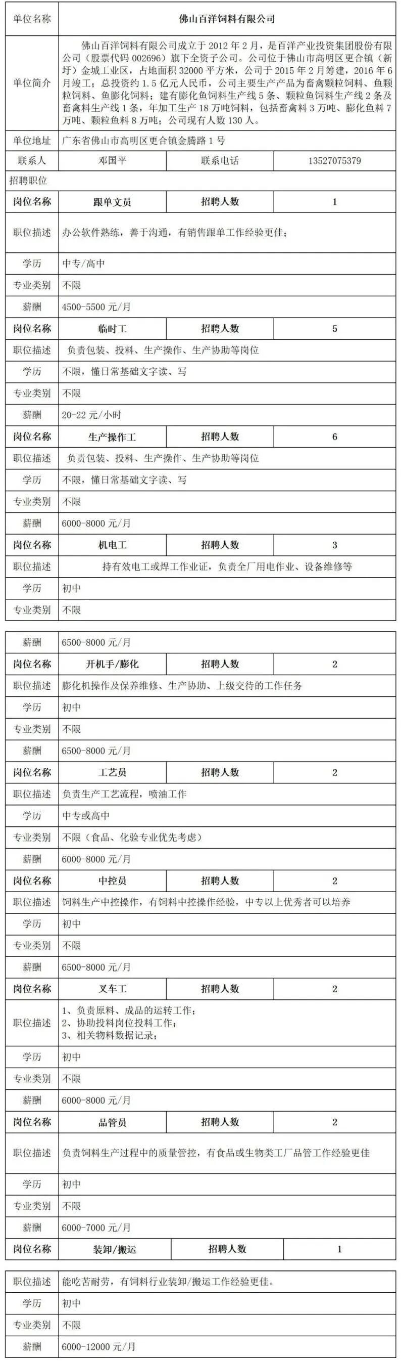 佛山百洋饲料有限公司招聘