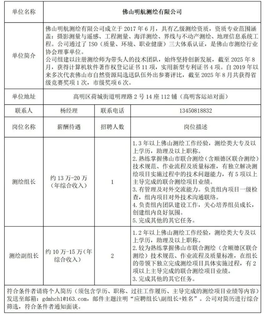 佛山明航测绘有限公司招聘