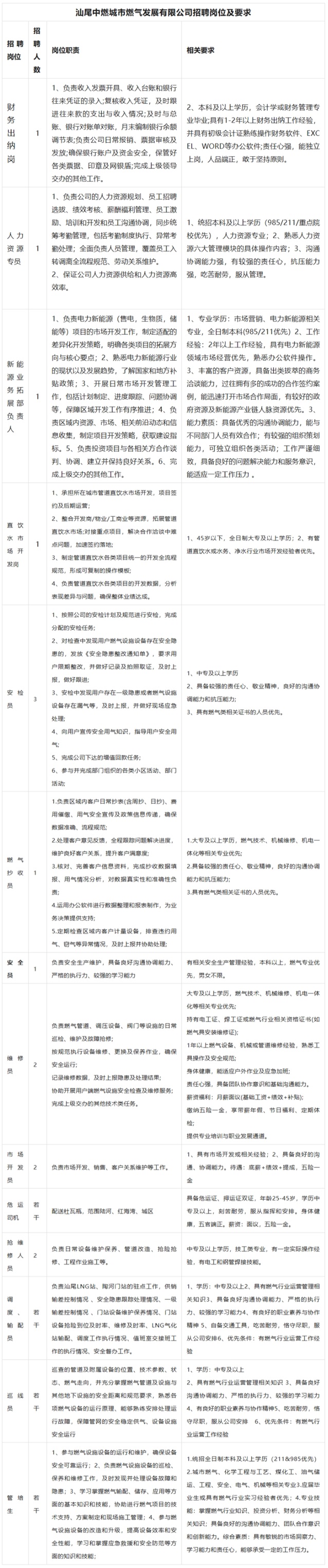 因汕尾中燃经营发展需要招聘财务出纳岗、人力资源专员、新能源业务拓展部负责人、直饮水市场开发岗、安检员、燃气抄收员、安全员、维修员、市场开发员、危运司机、抢维修人员、调度、输配员、巡线员、管培生等岗位。