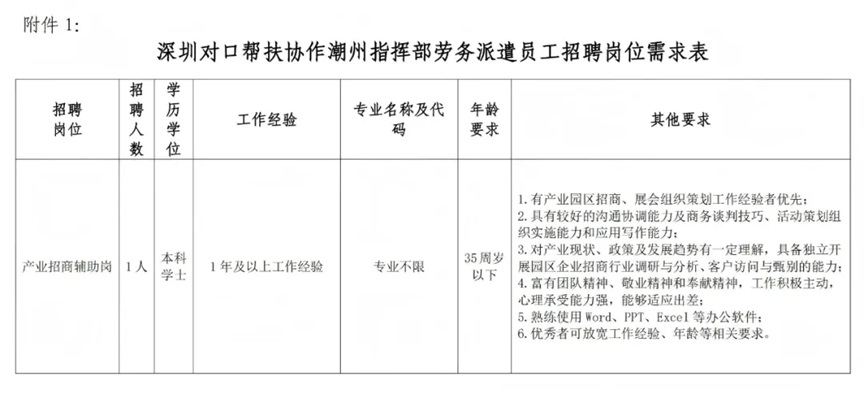 (报名岗位请详见附件1《深圳对口帮扶协作潮州指挥部劳务派遣员工招聘岗位需求表》各岗位信息);