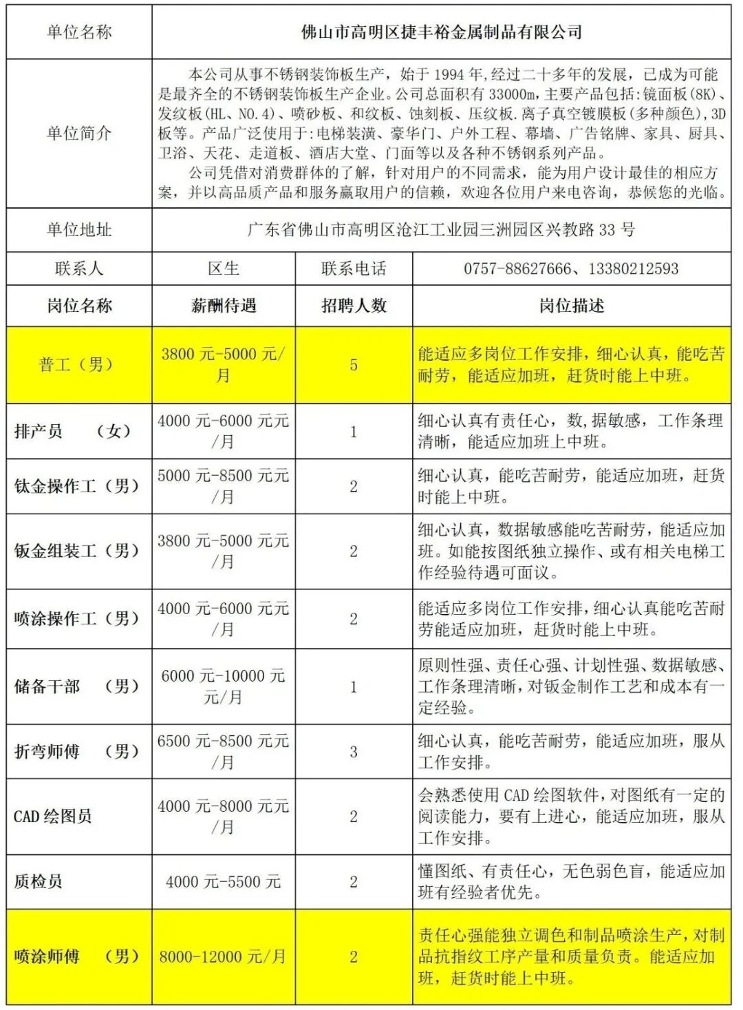 - 佛山市高明区捷丰裕金属制品有限公司招聘