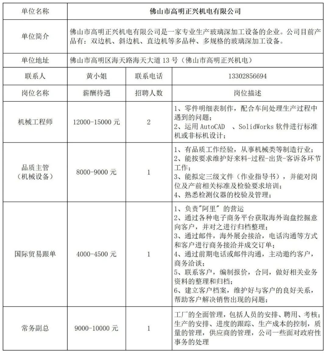 - 佛山市高明正兴机电有限公司招聘