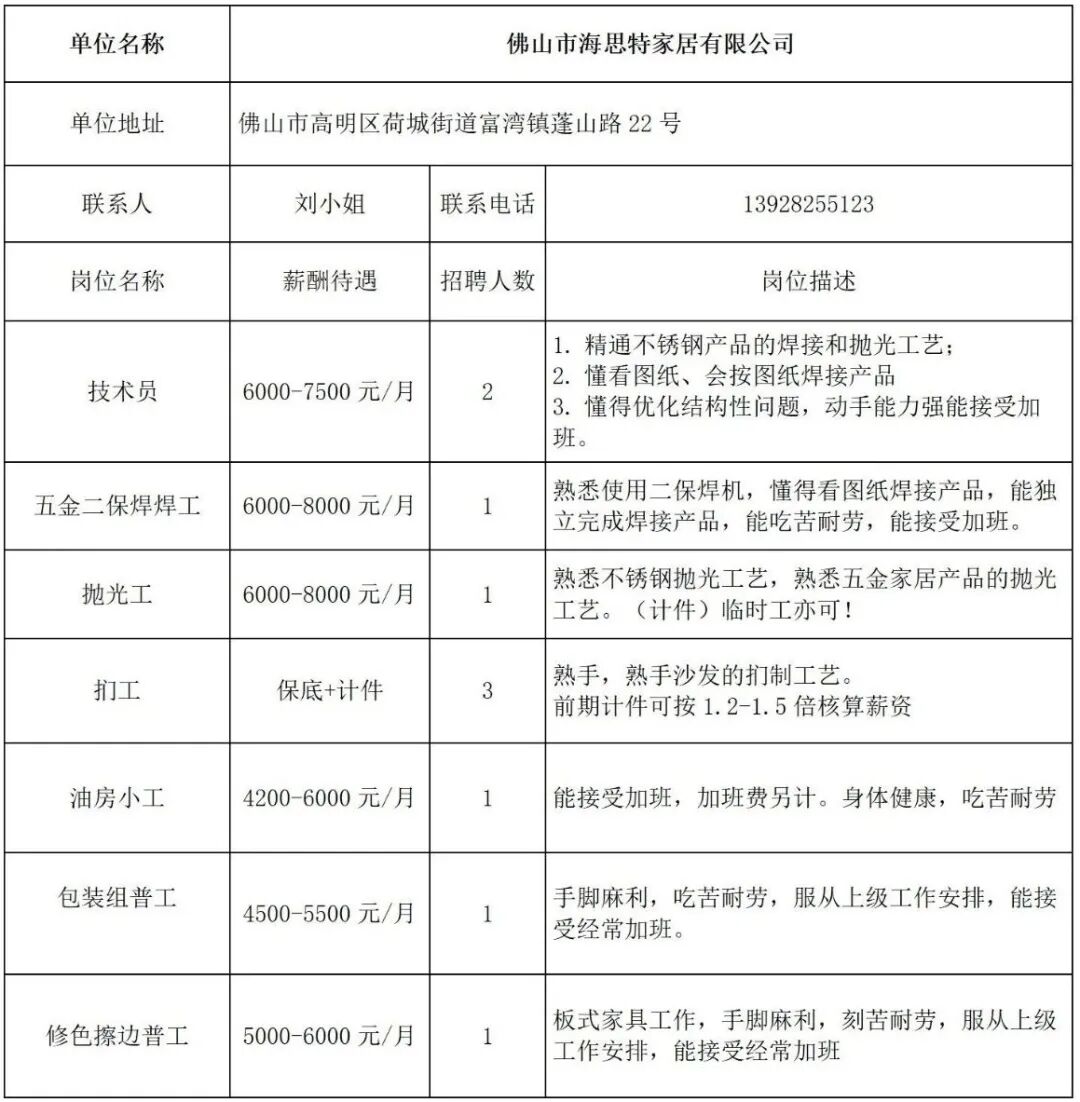 佛山市高明区捷丰裕金属制品有限公司招聘