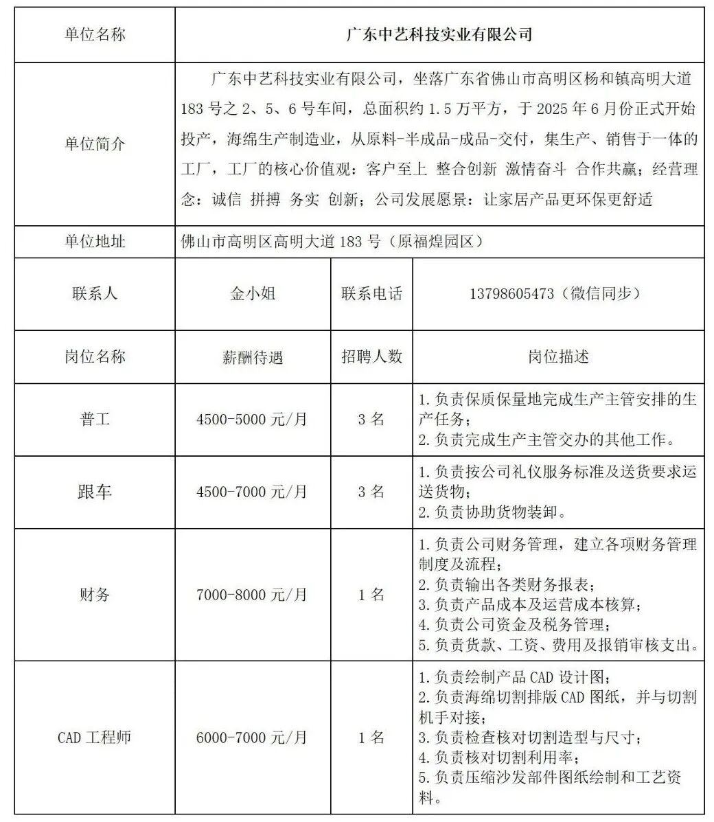 佛山市高明区捷丰裕金属制品有限公司招聘