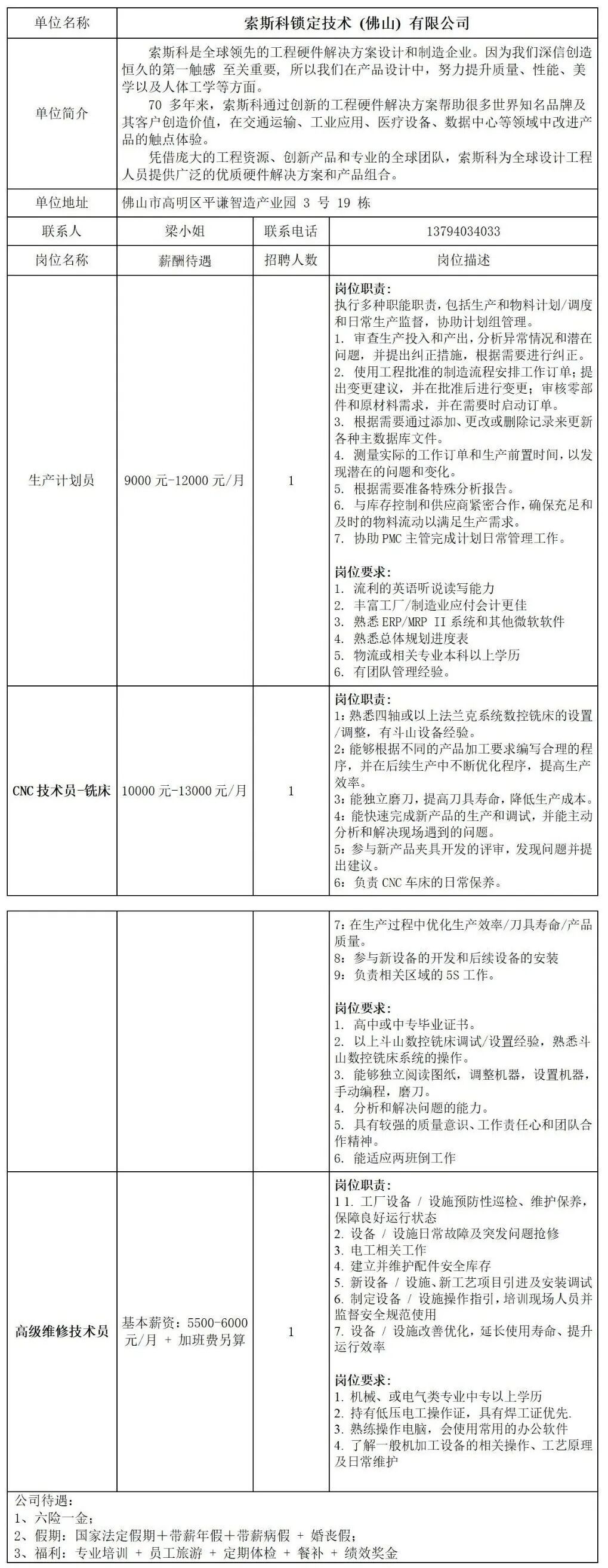 - 索斯科锁定技术 (佛山) 有限公司招聘