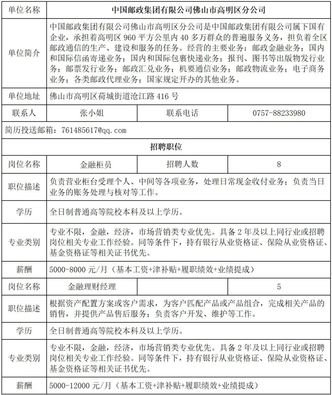 - 中国邮政集团有限公司佛山市高明区分公司招聘