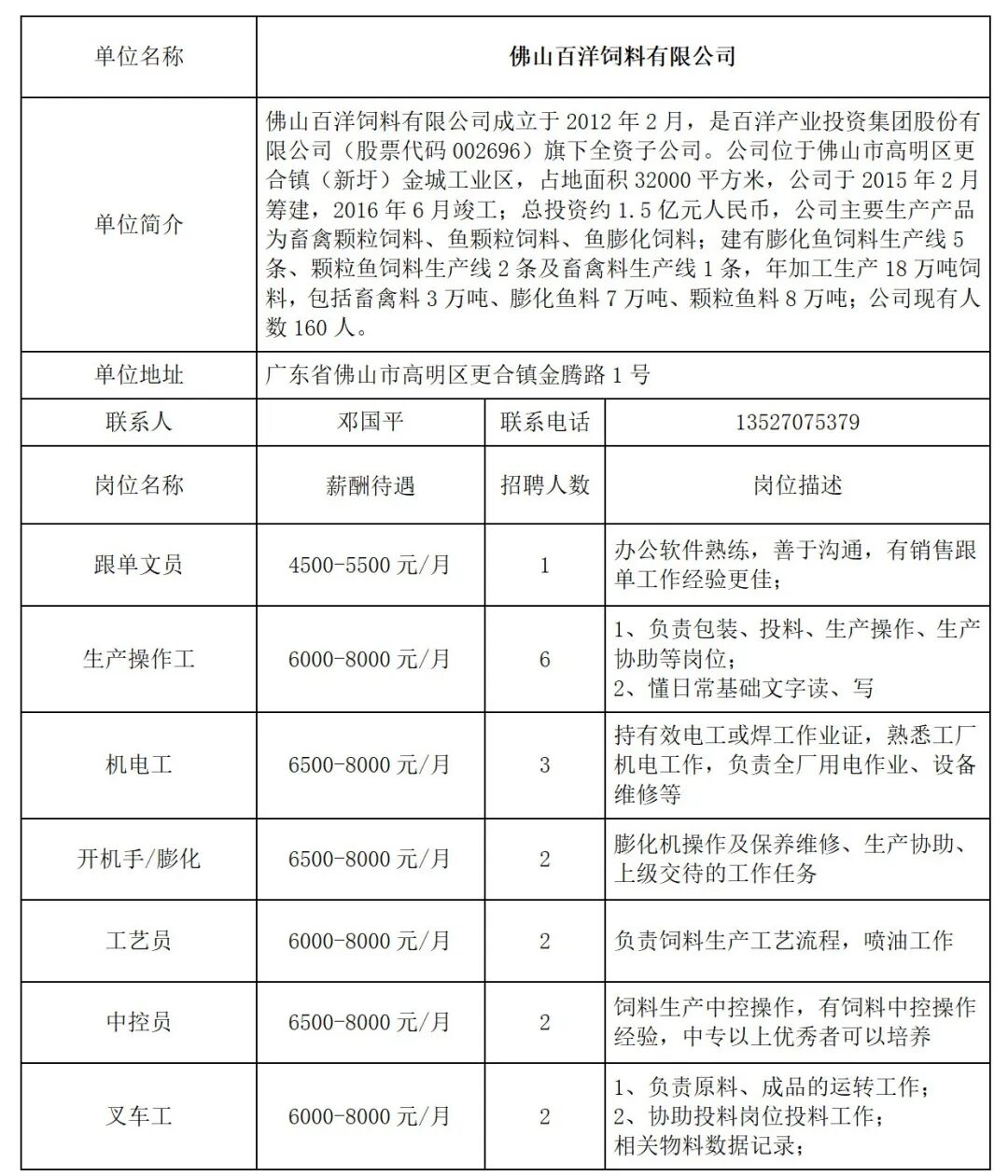 - 佛山百洋饲料有限公司招聘