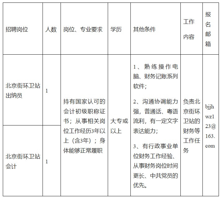 因实际工作需要,北京街面向社会公开招聘合同制财务人员2名,现就有关事项公告如下: