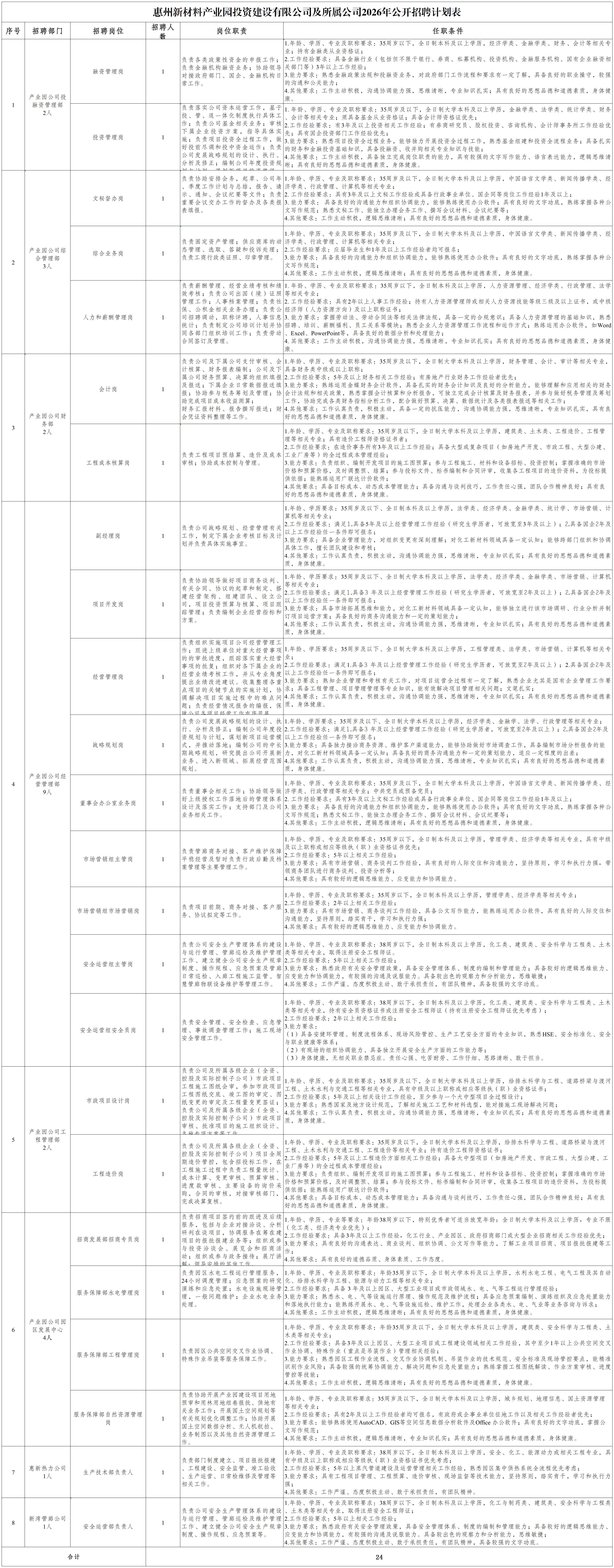 现根据业务发展需要,惠州新材料产业园投资建设有限公司及所属惠州惠新热力发展有限公司、惠州新湾公用管廊有限公司拟向社会公开招聘岗位工作人员24名,现将有关事项公告如下: