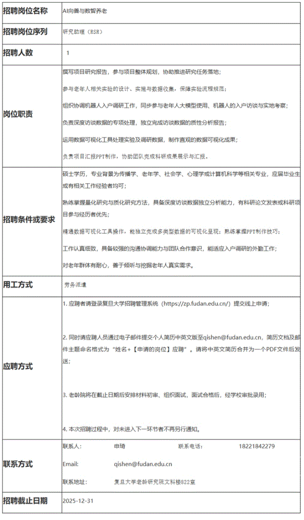 复旦大学老龄研究院招聘AI向善与数智养老岗位