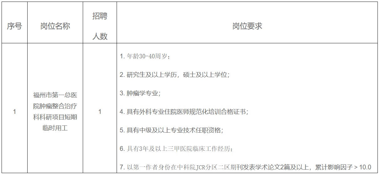 原标题:福州市第一总医院科研项目短期临时用工人员招聘公告
