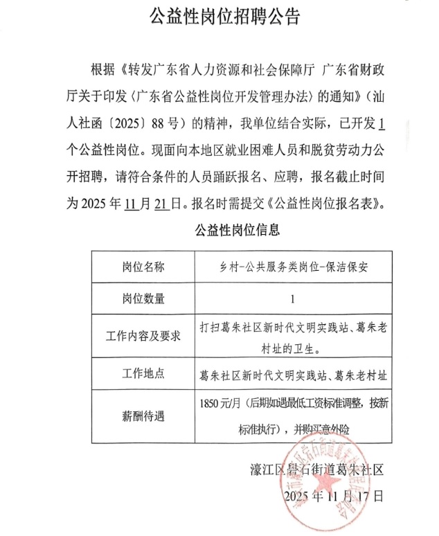 汕头市濠江区礐石街道葛朱社区居民委员会公益性岗位招聘公告