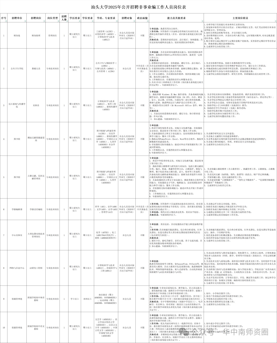 本次招聘工作人员10名,具体岗位及招聘条件等信息详见 附件《汕头大学2025年公开招聘非事业编工作人员岗位表》。