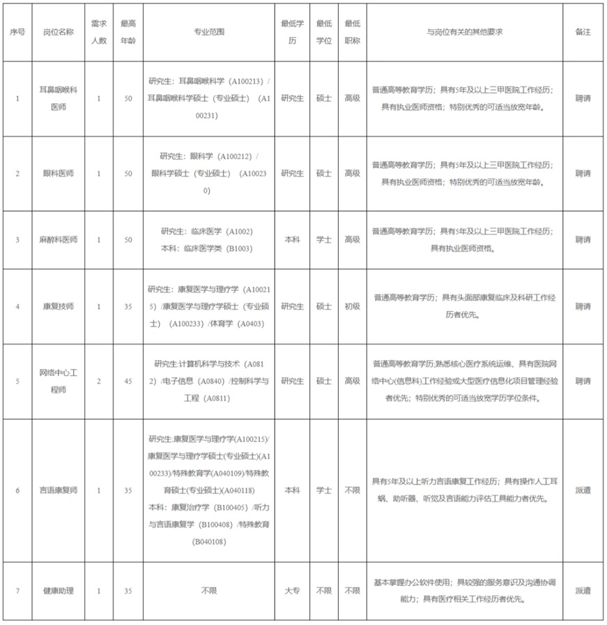 根据国家、省、市及我区相关会议及文件精神,深圳市龙岗区耳鼻咽喉医院因业务发展需要,面向社会招聘工作人员,岗位条件如下: